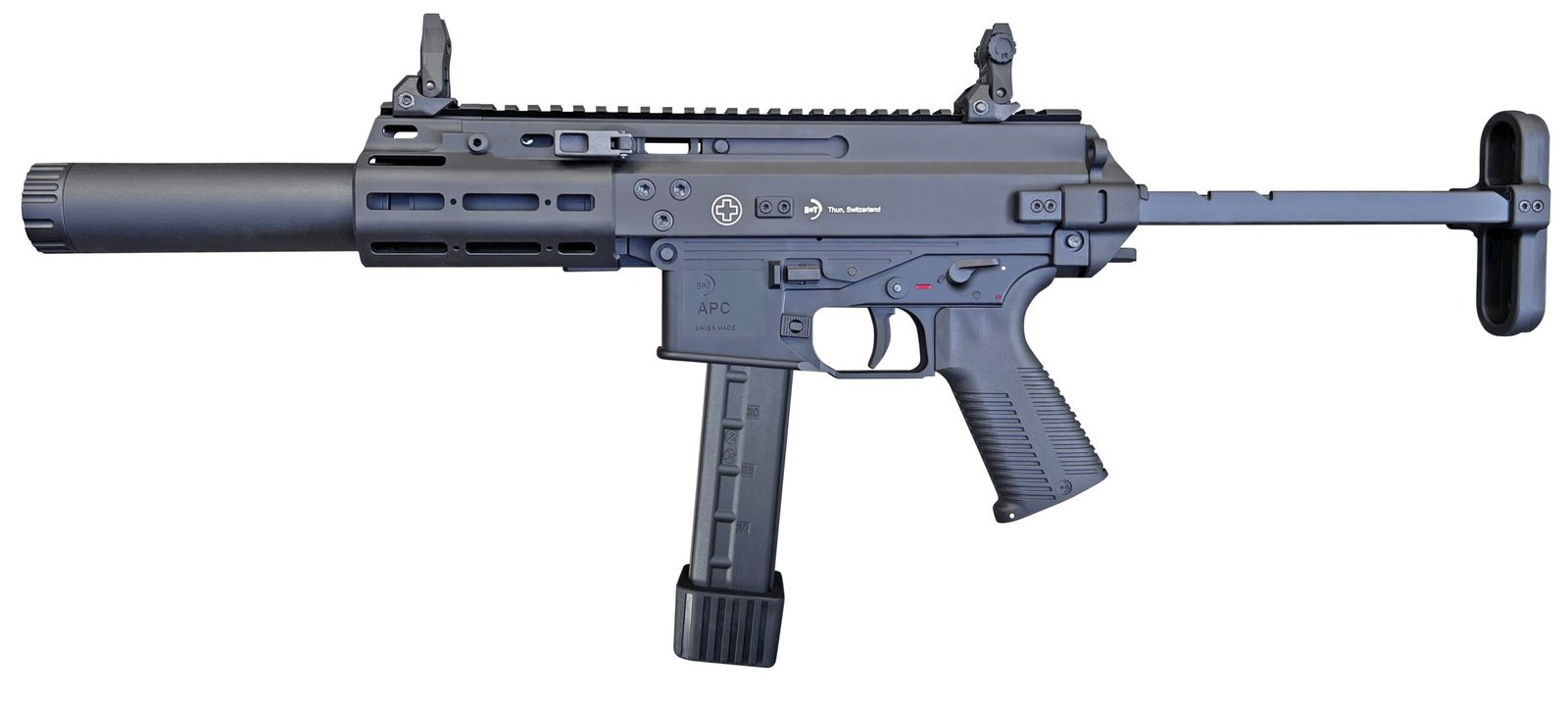 The Advanced Police Carbine (APC) series was designed for the demands of todays police, special forces, and military units around the world. As the hallmark of the B&T line, the APC series represents the ultimate in performance, reliability, and accuracy. The APC family includes the flexible and adaptable APC9/40 & 45/10mm, the rifle caliber APC223/556/300 line, and the ultimate in semiautomatic precision, the APC308. With a comprehensive suite of accessories created specifically for these platforms, the APC series represents a breakthrough in customization and modularity for every operator, and every specialized mission.The licensed replica of the US Army’s newest SMG – B & T Air APC9 Series GBB represents the ultimate in performance, reliability, and accuracy. Precision CNC T6061T6 Aluminum Upper ReceiverMILSPEC Type III hard anodized finishPrecision CNC T6061T6 Aluminum Handguard, and mock suppressor (SD models)Precision CNC T6061T6 Aluminum Billet Bolt Receiver PrecisionCNC S45C Steel Internal Parts Bolt Lock Buffer Feed Nozzle Buffer Steel Outer barrel with thread onTri-lug flash hider Steel 12mm to 14mm CCW thread adaptor 6.03mm precision honed inner barrel TDC Direct Pressure Hop Up Unit with TM MWS Spec BuckingAluminium ambidextrous non reciprocating charging handle Multi position steel telescoping stock with rubber buttpad (K models) Side folding polymer UMP style stock (Full sized models)IMI Style flip up sights set AR Style pistol grip M-LOK interface 1913STD. accessory rails Front sling mount / hand stop Inner Inner Barrel: 129mm (6.03mm ID)Weight: N.W. 3300g / G.W. 4000gLength: 382-562mm (Stock Folded / Extended)710mm (APC9K SD2 full stock w/Extension Barrel)
