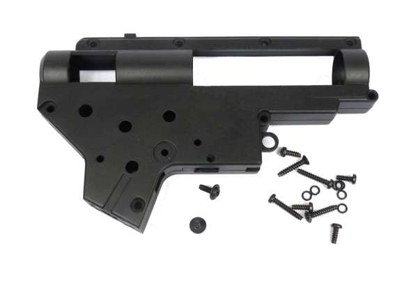 Guarder Enhanced Version 2 GearboxSpecial Super Reinforcing designThe Inside rail has been polished100% Fits for MARUI AEG System Parts6mm Bushing not IncludedWeight: 350gColor: Dark Grey CoatingMaterial: Zinc Alloy Metaltakes 6mm bushes