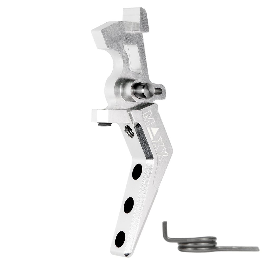 CNC Aluminum Advanced Speed Trigger (Style A) is specially designed for fast response, smooth and consistent trigger pull on Ver. 2 Gear Box of M4/M16 series Airsoft AEG Rifles.The Advanced Speed Trigger has multiple adjustment points to control pre-travel and over-travel to shorten trigger pull and prevent damage to electronic switches on controller boards.The Advanced Speed Trigger is completely compatible with the popular TITAN Electronic Module from Gate for Ver. 2 Gear Box.The Advanced Speed Trigger is designed with relieve cuts to function in most Tokyo Marui (TM) spec. AEG and HPA systems.The main pivot pin of the trigger is made from Titanium for maximum strength and durability.The body of the trigger is CNC machined out of a solid block of Aircraft Grade Aluminum.The Aluminum and Titanium construction makes this trigger very light and durable.Moreover, the trigger is carefully chamfered the edges and securely fitted with three rubber pads to ensure comfort, enhance traction and secure grip.With the unique shapes, stylish design and colors, we will have an option to fit your style needs.