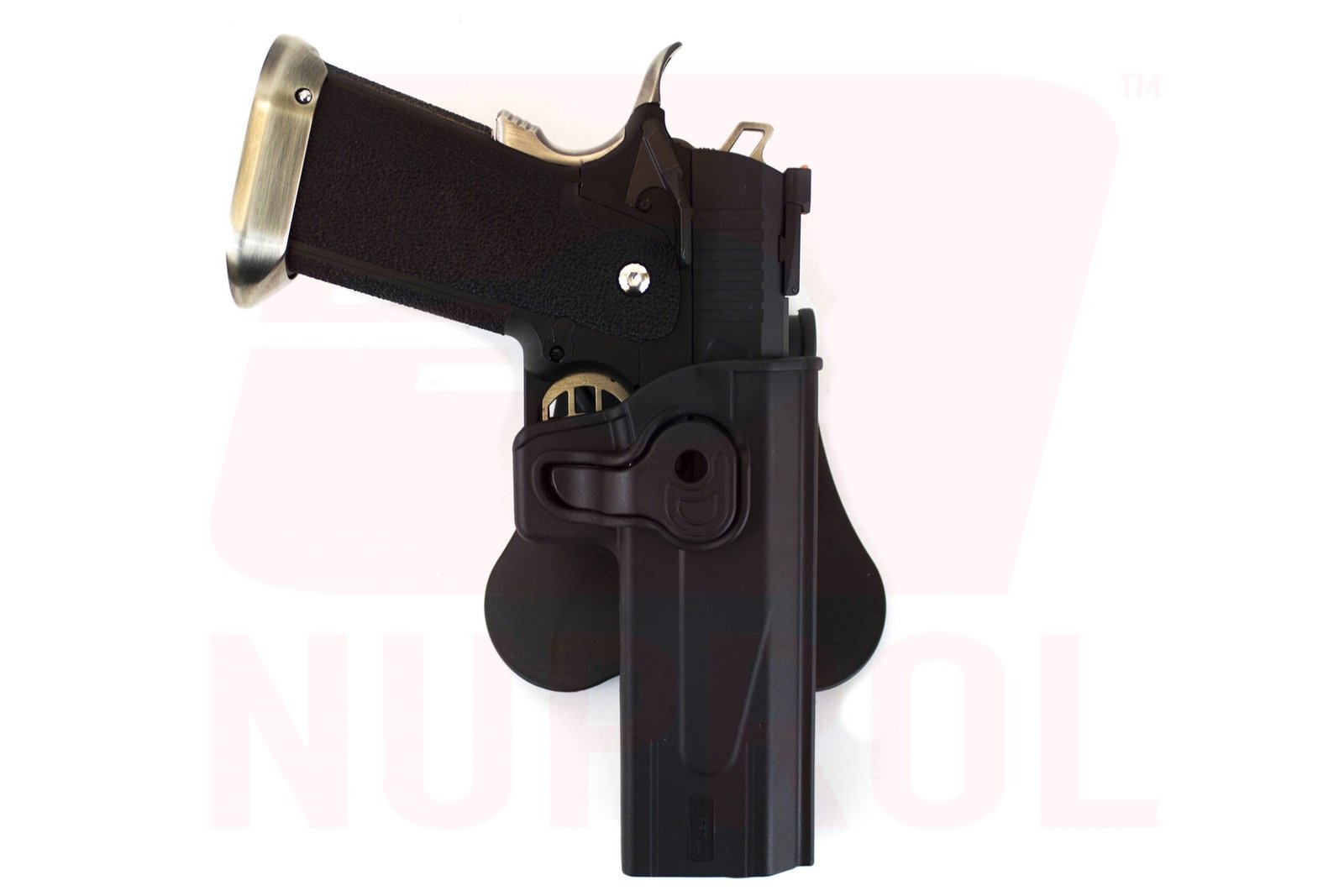 NUPROL holster series are made of durable law enforcement grade black polymer and specifically designed for use with WE Pistols that do not fit standard holsters.NUPROL Perfect Fit holsters are a rotating belt holster that fits WE, TM, and many others. NUPROL also offer a Drop Leg Panel and MOLLE Adaptor for a choice of platforms