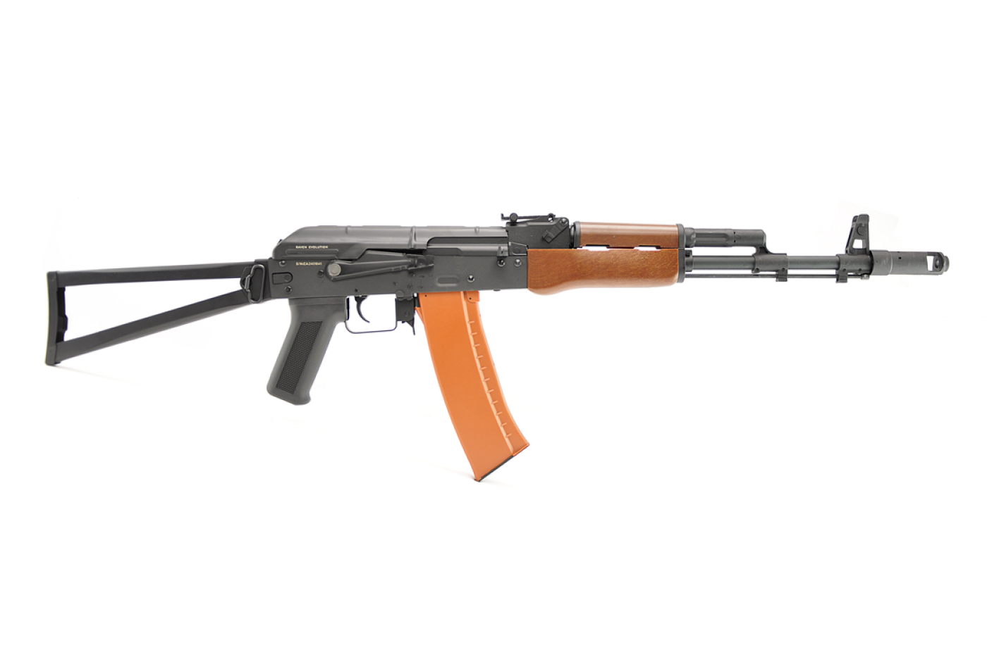 Introducing our new line of Raven Evolution Neo AKs with high strength polymer construction. In each Neo line of AKs, youll receive our new Electronic Trigger System (ETS) that allows the use of 11.1v batteries and boasts improved trigger response and reliability. Raven Evolution Neo AK AEGs features lightweight but strong polymer construction, metal upper dust cover, side mount, full metal v3 gearbox, 18:1 steel gears, 8mm ball bearings, bearing spring guide, quick change spring, 20,000 rpm motor, 6.03 brass inner barrel all whilst being surprisingly affordable. Whether you desire a classic AK or a more modern AK, with 10 models The Raven Evolution NEO series of AKs has an AK to fit your needs.The Raven Evolution Neo AKS74 is our take on the classic Russian AK rifle. Built with a polymer body and features a two piece faux wood handguard and a metal folding skeleton stock. This AKS74 is wired to Deans in the dust cover, features an adjustable slider hop-up, metal optic side mount, metal dust cover and charging handle, metal front sight and an all metal gearbox.Weight (lbs): 5Length (Folded / Unfolded) : 37-1/8 / 28Inner Barrel: 430 mm – 6.03Thread: 14mm NegativeGearbox: Ver 3 Full Metal, Fully UpgradeableMotor: Short TypeFire Modes: Semi/Full-Auto, SafetyBattery: 7.4v – 11.1v recommendedHop Up: Slider type adjustablePackage Includes: gun, velocity test report and quality certificate, mid-cap magazine, deans to tamiya adapter, barrel cleaning rod, m90 spring
