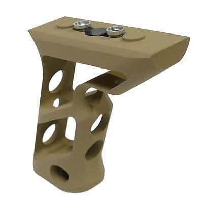 Rebel CNC Keymod Long Angled Skeleton Grip | Ultralight PrecisionDitch the bulk and sharpen your rifle’s profile. The Rebel CNC Long Angled Skeleton Grip is the ultimate fusion of aggressive aesthetics and high-performance handling. Specifically engineered for Keymod rail systems, this grip is for the player who wants a high-speed, low-drag setup without sacrificing a rock-solid hold.By utilizing a “Skeletonized” design, Rebel has stripped away every unnecessary gram of weight, leaving you with a grip that is incredibly strong but light enough to keep your muzzle transitions lightning-fast.Performance Through DesignPrecision CNC Machining: Carved from a single block of aerospace-grade aluminium, ensuring perfect symmetry and zero-tolerance fitment on your Keymod handguard.Ergonomic Angled Profile: The calculated 15-degree angle reduces wrist strain and encourages a natural “C-clamp” or “thumb-over-bore” grip, giving you better control over your AEG or GBB muzzle climb.Aggressive Skeletonized Aesthetic: Not just for looksthe cut-outs provide additional tactile points for your fingers to lock into, ensuring your hand stays put even in rain, mud, or the heat of a summer skirmish.Extended “Long” Surface: The elongated profile provides ample real estate for players with larger hands or those who prefer a variety of hand placements depending on the engagement distance.Technical SpecificationsFeatureSpecificationMaterialCNC 6061-T6 AluminiumMounting SystemKeymod (Direct Attachment)DesignLightweight SkeletonizedFinishHard Anodized (Matte Black / Red / Blue)HardwareSteel Keymod Nuts & Bolts IncludedWhy Go Skeletonized?In a long Milsim op, “ounces equal pounds, and pounds equal pain.” The Rebel Skeleton Grip provides the structural integrity of a solid vertical grip at a fraction of the weight. It allows you to maintain a slim, snag-free profile when navigating dense brush or tight corridors, making it the perfect choice for “Recce” style builds or lightweight CQB blasters.Pro Tip: Because this grip is made of aluminium, its an excellent choice for bracing against barricades or window frames. Unlike polymer grips, it won’t flex or “give” when you’re using the environment to stabilize a long-range shot.Ready to overhaul your front end? Fill in the gaps with Rebel MLOK Rail Covers to give you a fully textured, custom-feel handguard.